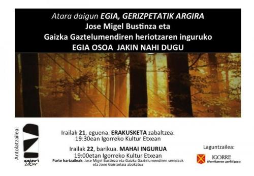 Egiari Zor Fundazioak, Igorreko Udalarekin elkarlanean, datorren irailaren 22an mahai-ingurua antolatu du Igorreko Kultur Etxean, 1997an Bilbon hil zituzten Gaizka Gaztelumendi eta Jose Migel Bustinzaren heriotzen inguruan jarduteko. Bezperatik erakusketa bisitatzeko aukera ere izango da. 2017-09-12 19:15:07[...]