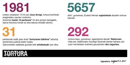 Tortura gure herriak bizi izandako gatazka politikoaren testuinguruan gertatutako drama handienetarikoa da. Euskal Memoria Fundazioak dio giza eskubideen urraketa larri hori gutxienez 4.643 pertsonak jasan dutela. Zifra honi gehitzen bazaio biolentzia praktikara eraman duten agente ezberdinek eragindako heriotza kopurua (1.200etik gertu beharko lukeen zenbakia), argazki argi bat izango dugu parez pare: zauriak sendatzeko eta elkarbizitzen hasteko beharra duen jendarte batena, hain zuzen.
